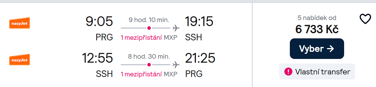 Doporučuju tenhle let: https://www.skyscanner.cz/transport/flights/prg/ssh/260327/260405/?adultsv2=1&childrenv2=&cabinclass=economy&rtn=1&preferdirects=false&outboundaltsenabled=false&inboundaltsenabled=false